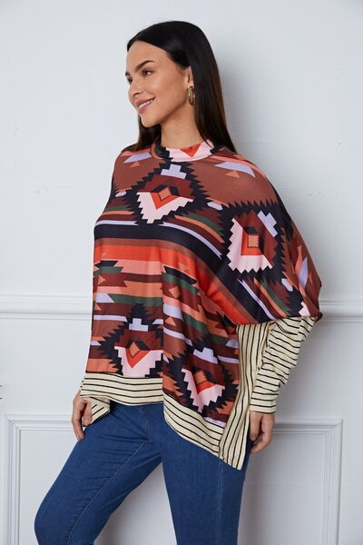 Geometric Striped Splicing Round Neck Blouse