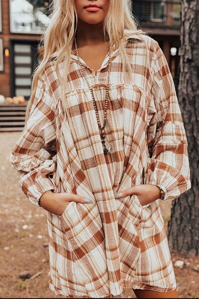 Plaid Collared Neck Long Sleeve Mini Shirt Dress