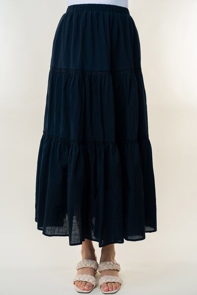 A High Waisted Tiered Maxi Skirt is a stylish and versatile piece that features a high-rise waist and multiple tiers of fabric that create a flowy and feminine silhouette. This type of skirt is often long in length, reaching the ankles or floor, making it perfect for creating a bohemian or romantic look. The high waist accentuates the natural waistline and elongates the legs, while the tiered design adds volume and movement to the skirt. Pair it with a fitted top or a tucked-in blouse for a flattering and stylish outfit that can be dressed up or down for various occasions. The High Waisted Tiered Maxi Skirt is a chic and elegant choice that can add a touch of drama to your wardrobe.